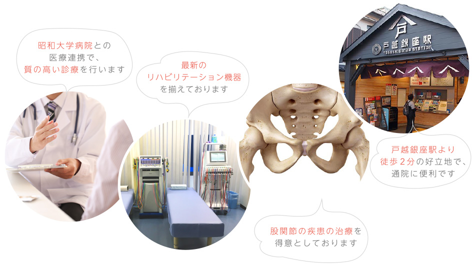 - 変形性股関節症、寛骨臼形成不全症、大腿骨頭壊死症、などの股関節疾患